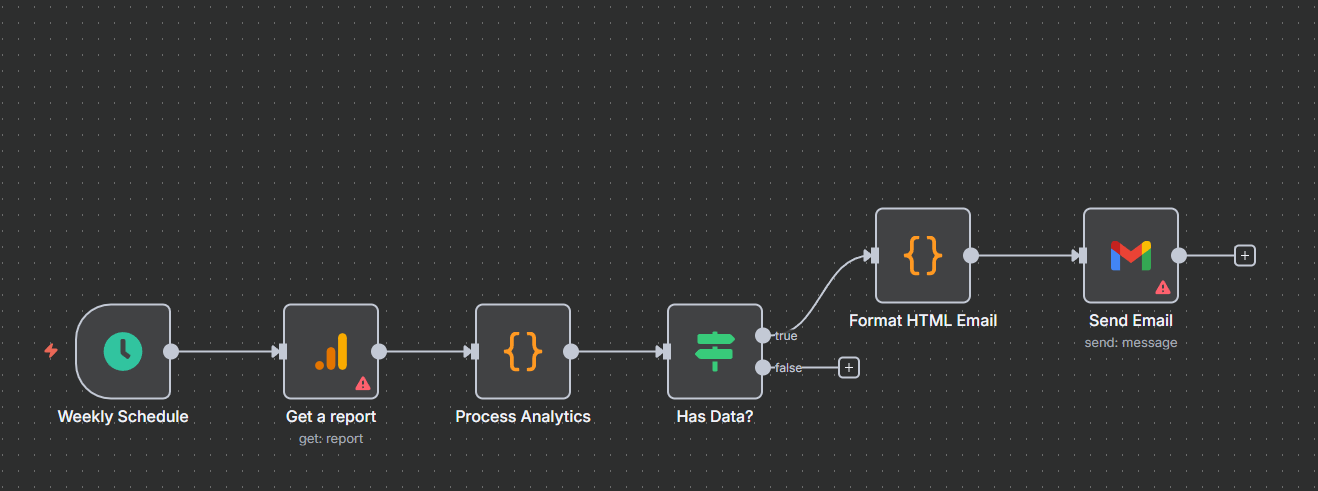 In this post, we’ll create a workflow that fetches your site metrics from Google Analytics, formats them into clean HTML, and emails them to you automatically using n8n, the open-source automation platform that’s basically Zapier on steroids (and self-hostable).